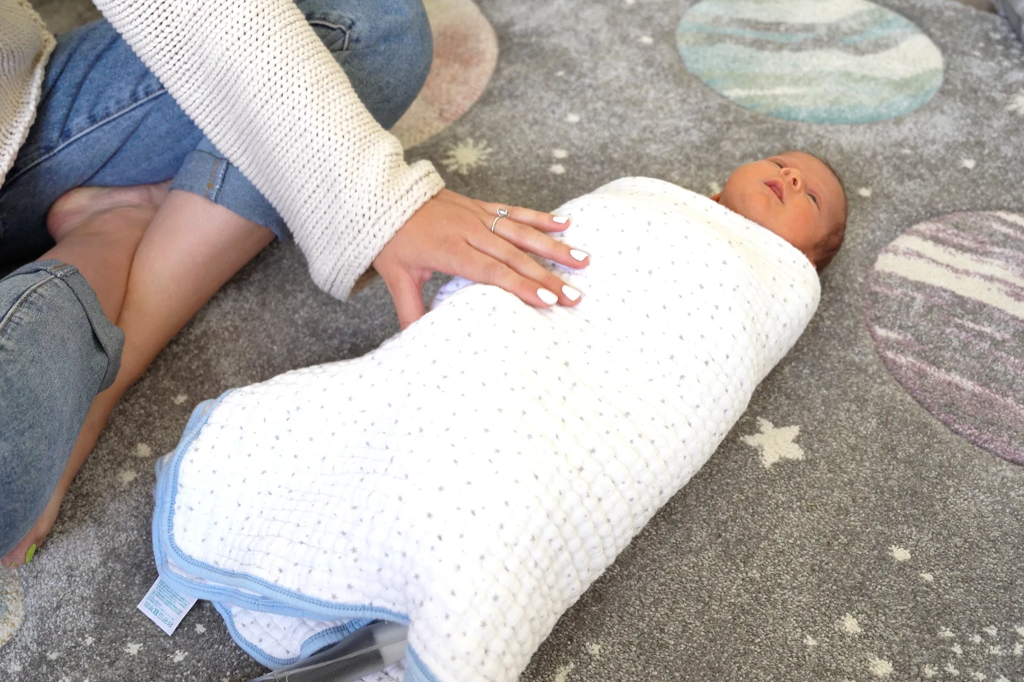 Swaddle your baby like you normally would, but be sure that the optic panel is INSIDE the swaddle with your baby. Again, Jaundice is treated best when baby's skin is exposed to the blue light.